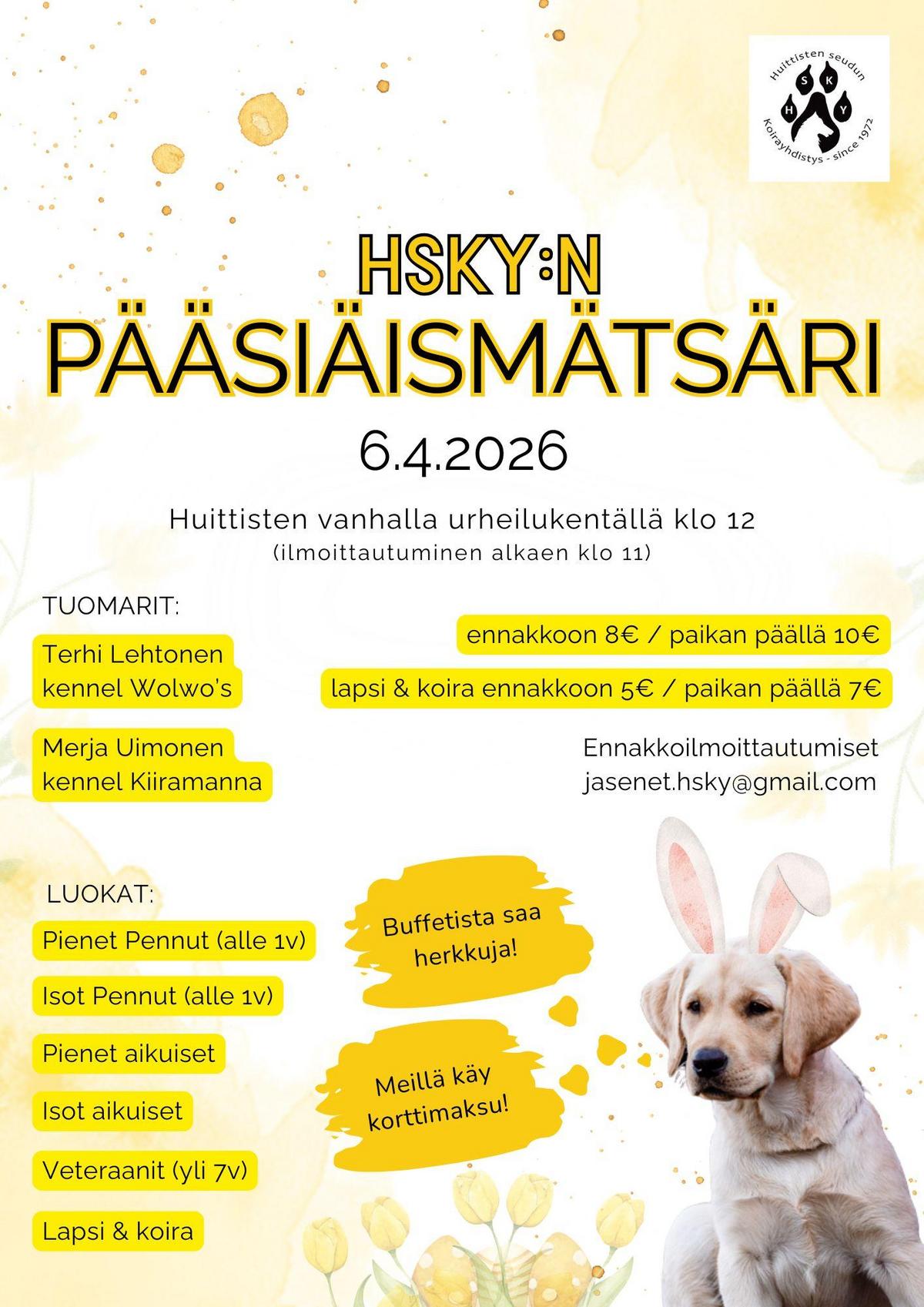 Huittisten Seudun Koirayhdistys järjestää pääsiäismätsärin pääsiäismaanantaina 6.4.2026 Huittisten vanhalla urheilukentällä klo 12 (ilmoittautuminen klo 11 alkaen)